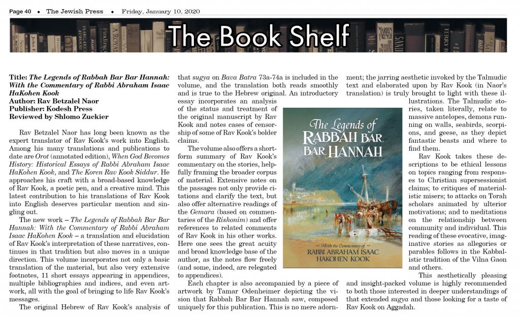 Title: The Legends of Rabbah Bar Bar Hannah: With the Commentary of Rabbi Abraham Isaac HaKohen Kook Author: Rav Betzalel Naor Publisher: Kodesh Press Reviewed by Shlomo Zuckier Rav Betzalel Naor has long been known as the expert translator of Rav Kook’s work into English. Among his many translations and publications to date are Orot […]